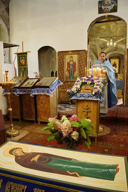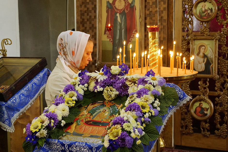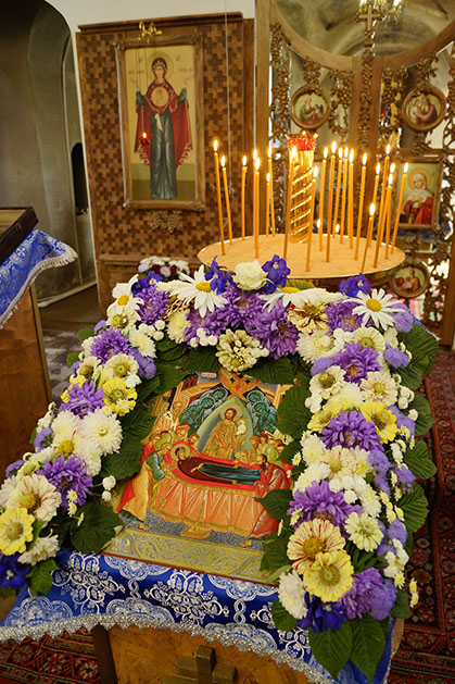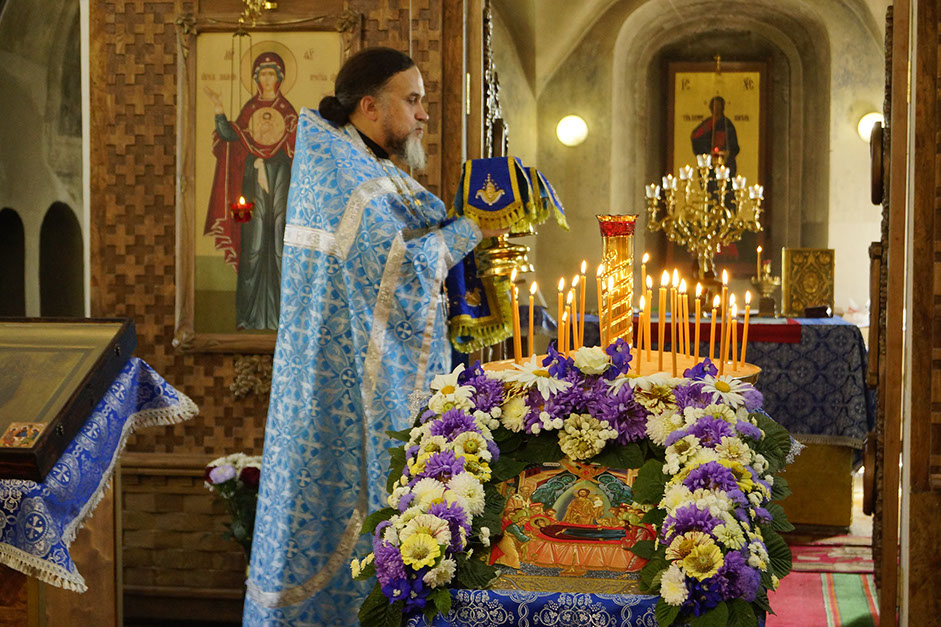 Вечером настоятель Краснохолмского Свято-Николаевского архиерейского подворья иером. Силуан отслужил всенощное бдение с чином Погребения Пресвятой Богородицы, в ходе которого прихожане прошли Крестным ходом с плащаницей Пресвятой Богородицы вокруг храма.