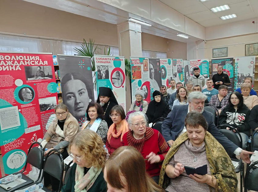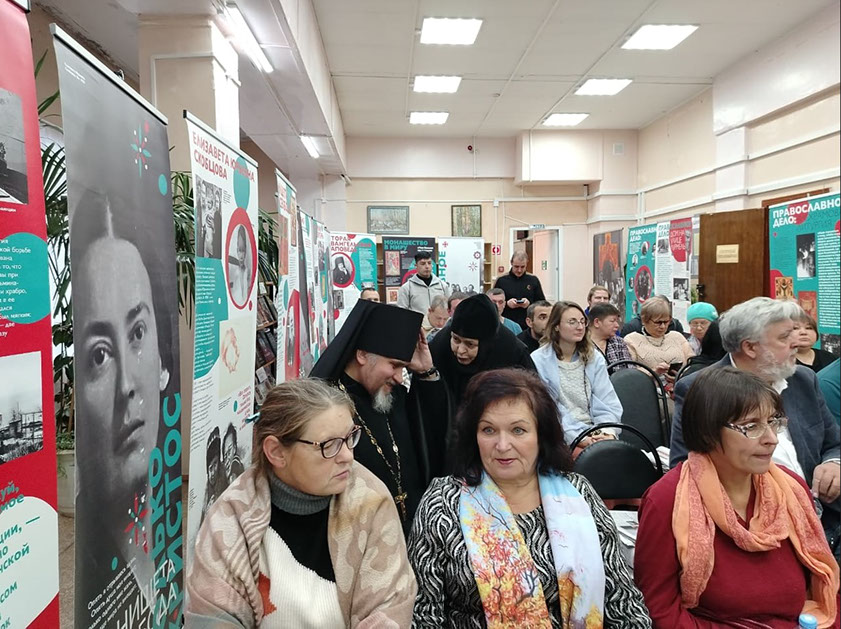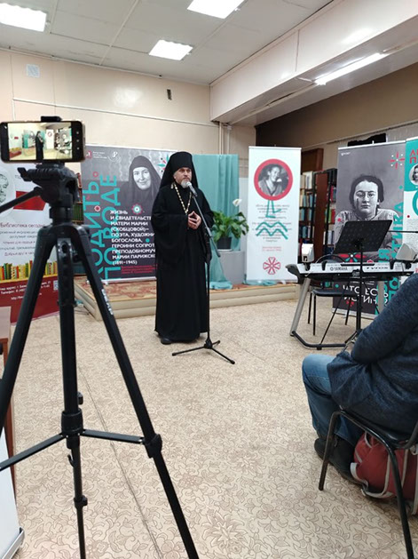 Иеромонах Силуан обратился к собравшимся с приветственным обращением от имени управляющего Бежецкой епархией архиепископа Каллистрата. Ответственный по делам культуры в Бежецкой епархии уделил особое внимание на часть жизни матери Марии - после ее монашеского пострига и пожелал помощи Божией в проведении выставки.