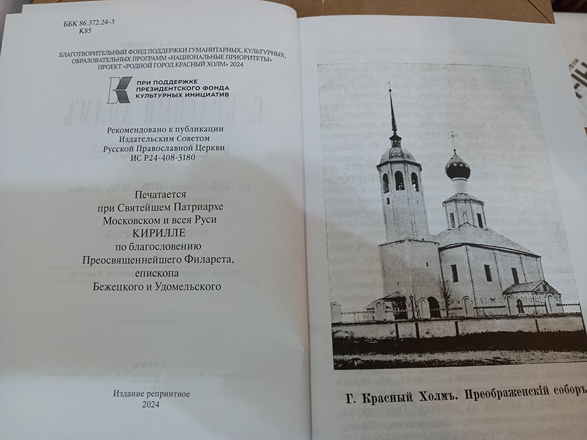 Книга была издана в рамках проекта "Родной город Красный Холм", который реализует Благотворительный фонд "Национальные приоритеты" при поддержке Краснохолмского Свято-Николаевского архиерейского подворья д. Слобода Краснохолмского муниципального округа Тверской области и Президентского фонда культурных инициатив: