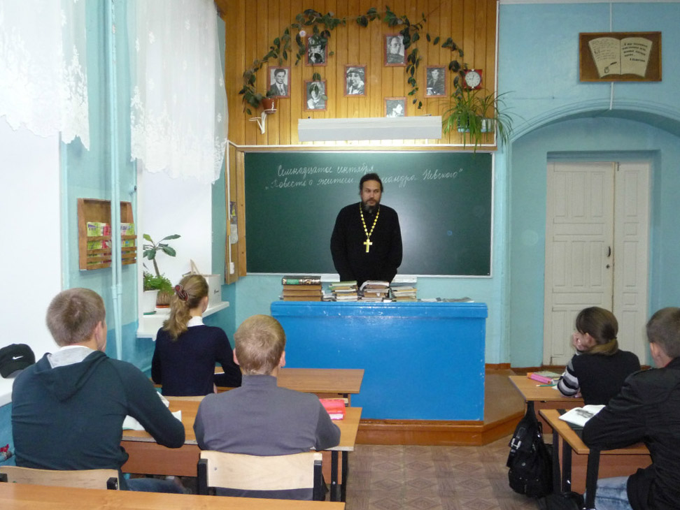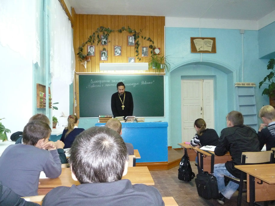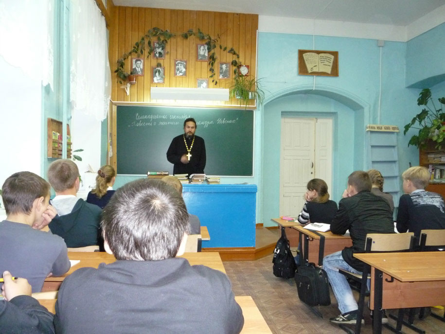 17 сентября в 8-м классе 1-й школы г. Красный Холм настоятель Краснохолмского Свято-Николаевского архиерейского подворья иеромонах Силуан (Конев) провел урок литературы, посвященный "Повести о житии...великого князя Александра Невского". Иеромонах Силуан еще 3 года назад был в числе братии Алесандро-Невской Лавры г. Санкт-Петербурга, где покоятся мощи князя Александра, и участвовал в написании сценария документального фильма о святом князе.