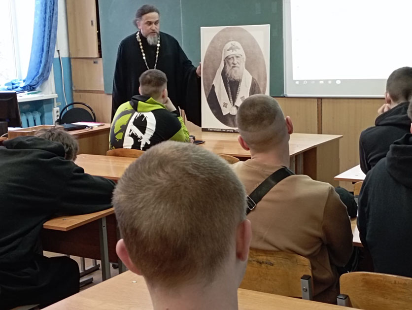 27 марта настоятель Краснохолмского Свято-Николаевского архиерейского подворья иеромонах Силуан (Конев) провел беседу с учащимися Краснохолмского колледжа. Речь шла об истории Русской Православной Церкви в XX веке и о святителе Тихоне Беллавине, патриархе Московском и всея Руси, 100-летия со дня блаженной кончины которого отмечается в 2025 году.