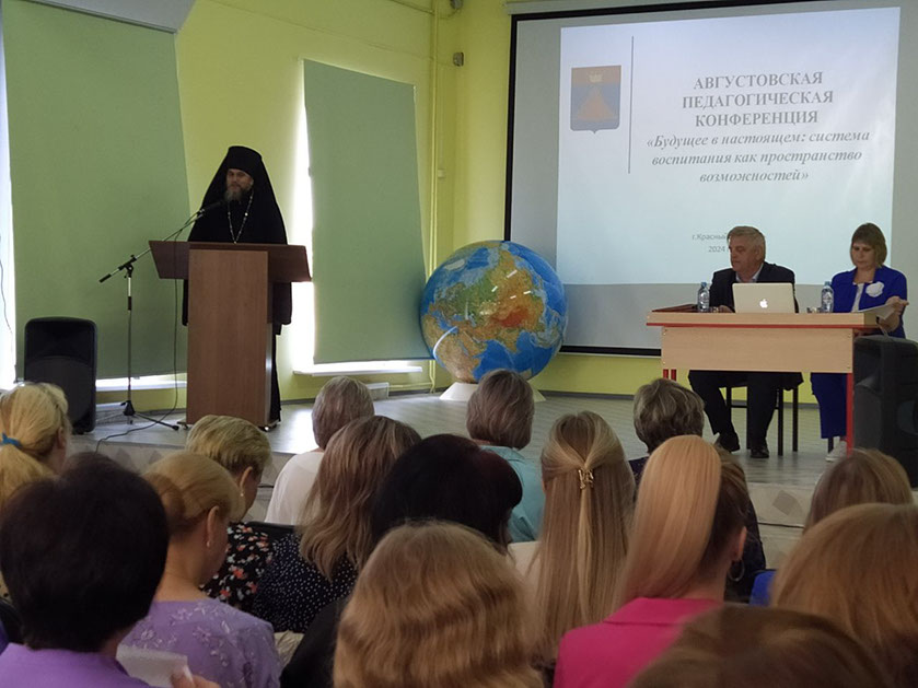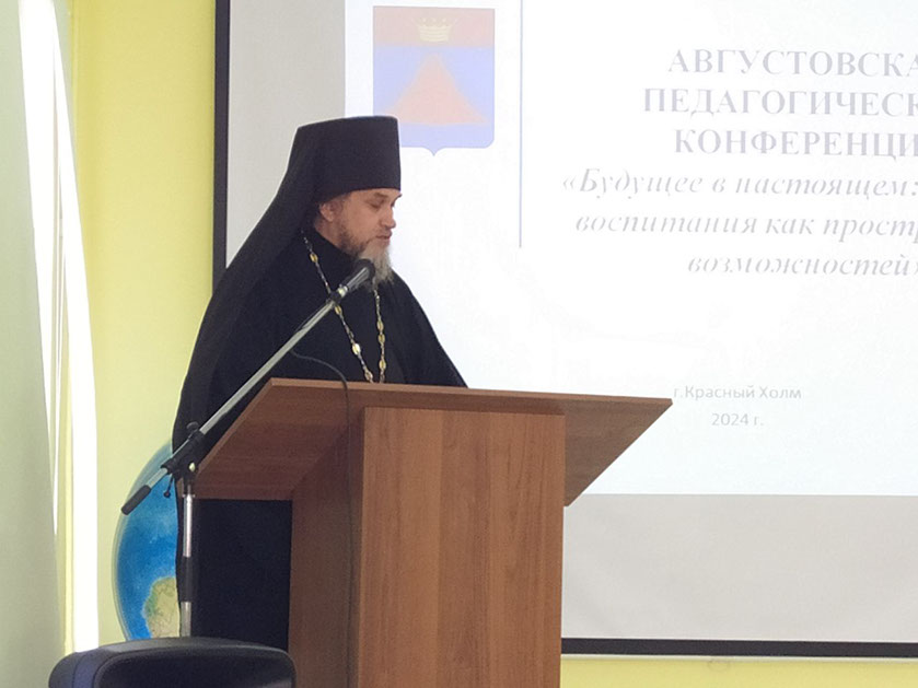 27 августа настоятель Краснохолмского Свято-Николаевского архиерейского подворья иеромонах Силуан (Конев) выступил на педагогической конференции работников системы образования Краснохолмского муниципального округа Тверской области.