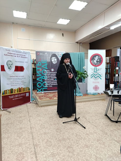 Иеромонах Силуан обратился к собравшимся с приветственным обращением от имени управляющего Бежецкой епархией архиепископа Каллистрата. Ответственный по делам культуры в Бежецкой епархии уделил особое внимание на часть жизни матери Марии - после ее монашеского пострига и пожелал помощи Божией в проведении выставки.